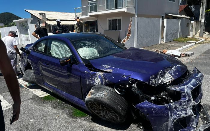 Um carro da BMW ficou destruído depois que o motorista bateu no muro de uma casa em Balneário Camboriú, no Litoral Norte de Santa Catarina, nessa Quinta-feira (05/03/26). O veículo é avaliado em R$ 650 mil. Ninguém ficou ferido.