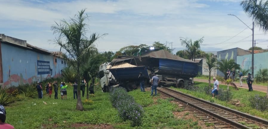 Uma carreta bitrem carregada com açúcar foi atingida por um trem na tarde desta Quinta-feira (13/11/25) em Rolândia, na região de Londrina. O impacto foi tão forte que o veículo chegou a ser arrastado por vários metros antes que a locomotiva parasse completamente. Parte da carga ficou espalhada sobre os trilhos, formando uma cena impressionante.